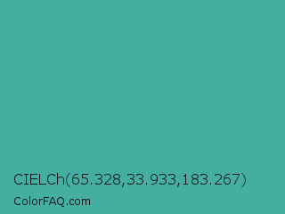 CIELCh 65.328,33.933,183.267 Color is a normal cyan color and the nearest color is Keppel #3ab09e. Hex code #44afa1 and RGB value is rgb(68,175,161). In RGB color space, this color is composed of 27% red, 69% green, 63% blue, In CMYK color space, this color is composed of 61% cyan, 0% magenta, 8% yellow , 31% black , In HSL color space, this color has a hue angle of 172° , 44% saturation and 48% lightness.