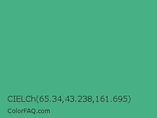 CIELCh 65.34,43.238,161.695 Color is a normal green color and the nearest color is Mint #3eb489. Hex code #47b185 and RGB value is rgb(71,177,133). In RGB color space, this color is composed of 28% red, 69% green, 52% blue, In CMYK color space, this color is composed of 60% cyan, 0% magenta, 25% yellow , 31% black , In HSL color space, this color has a hue angle of 155° , 43% saturation and 49% lightness.