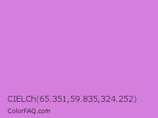 CIELCh 65.351,59.835,324.252 Color is a light magenta color and the nearest color is French Mauve #d473d4. Hex code #d67ede and RGB value is rgb(214,126,222). In RGB color space, this color is composed of 84% red, 49% green, 87% blue, In CMYK color space, this color is composed of 4% cyan, 43% magenta, 0% yellow , 13% black , In HSL color space, this color has a hue angle of 295° , 59% saturation and 68% lightness.