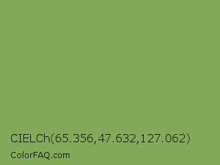 CIELCh 65.356,47.632,127.062 Color is a normal green color and the nearest color is Chelsea Cucumber #83aa5d. Hex code #81ab58 and RGB value is rgb(129,171,88). In RGB color space, this color is composed of 51% red, 67% green, 35% blue, In CMYK color space, this color is composed of 25% cyan, 0% magenta, 49% yellow , 33% black , In HSL color space, this color has a hue angle of 90° , 33% saturation and 51% lightness.