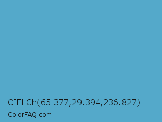 CIELCh 65.377,29.394,236.827 Color is a normal blue color and the nearest color is Shakespeare #4eabd1. Hex code #54a9ca and RGB value is rgb(84,169,202). In RGB color space, this color is composed of 33% red, 66% green, 79% blue, In CMYK color space, this color is composed of 58% cyan, 16% magenta, 0% yellow , 21% black , In HSL color space, this color has a hue angle of 197° , 53% saturation and 56% lightness.