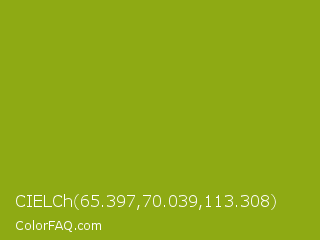 CIELCh 65.397,70.039,113.308 Color is a normal lime color and the nearest color is Citron #9fa91f. Hex code #8eaa14 and RGB value is rgb(142,170,20). In RGB color space, this color is composed of 56% red, 67% green, 8% blue, In CMYK color space, this color is composed of 16% cyan, 0% magenta, 88% yellow , 33% black , In HSL color space, this color has a hue angle of 71° , 79% saturation and 37% lightness.