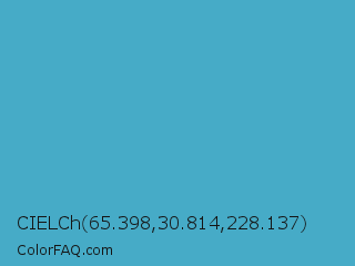 CIELCh 65.398,30.814,228.137 Color is a normal cyan color and the nearest color is Maximum Blue #47abcc. Hex code #46abc7 and RGB value is rgb(70,171,199). In RGB color space, this color is composed of 27% red, 67% green, 78% blue, In CMYK color space, this color is composed of 65% cyan, 14% magenta, 0% yellow , 22% black , In HSL color space, this color has a hue angle of 193° , 54% saturation and 53% lightness.