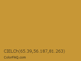 CIELCh 65.39,56.187,81.263 Color is a normal orange color and the nearest color is Satin Sheen Gold #cba135. Hex code #c79736 and RGB value is rgb(199,151,54). In RGB color space, this color is composed of 78% red, 59% green, 21% blue, In CMYK color space, this color is composed of 0% cyan, 24% magenta, 73% yellow , 22% black , In HSL color space, this color has a hue angle of 40° , 57% saturation and 50% lightness.