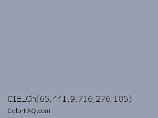 CIELCh 65.441,9.716,276.105 Color is a light blue color and the nearest color is Santas Gray #9fa0b1. Hex code #989fb0 and RGB value is rgb(152,159,176). In RGB color space, this color is composed of 60% red, 62% green, 69% blue, In CMYK color space, this color is composed of 14% cyan, 10% magenta, 0% yellow , 31% black , In HSL color space, this color has a hue angle of 223° , 13% saturation and 64% lightness.