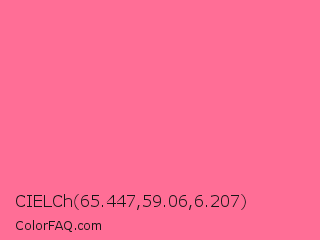 CIELCh 65.447,59.06,6.207 Color is a light rose color and the nearest color is French Pink #fd6c9e. Hex code #ff6e96 and RGB value is rgb(255,110,150). In RGB color space, this color is composed of 100% red, 43% green, 59% blue, In CMYK color space, this color is composed of 0% cyan, 57% magenta, 41% yellow , 0% black , In HSL color space, this color has a hue angle of 343° , 100% saturation and 72% lightness.