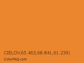 CIELCh 65.463,68.841,61.239 Color is a normal orange color and the nearest color is Cadmium Orange #ed872d. Hex code #eb852e and RGB value is rgb(235,133,46). In RGB color space, this color is composed of 92% red, 52% green, 18% blue, In CMYK color space, this color is composed of 0% cyan, 43% magenta, 80% yellow , 8% black , In HSL color space, this color has a hue angle of 28° , 83% saturation and 55% lightness.