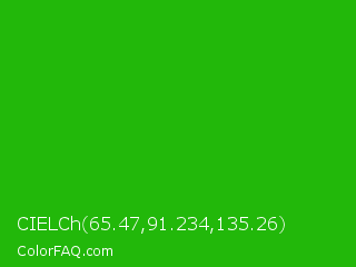 CIELCh 65.47,91.234,135.26 Color is a normal green color and the nearest color is Slimy Green #299617. Hex code #22b80a and RGB value is rgb(34,184,10). In RGB color space, this color is composed of 13% red, 72% green, 4% blue, In CMYK color space, this color is composed of 82% cyan, 0% magenta, 95% yellow , 28% black , In HSL color space, this color has a hue angle of 112° , 90% saturation and 38% lightness.