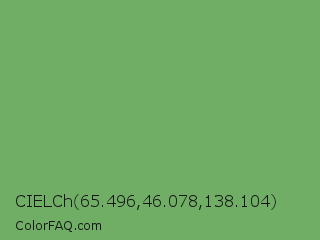 CIELCh 65.496,46.078,138.104 Color is a normal green color and the nearest color is Bud Green #7bb661. Hex code #70ae66 and RGB value is rgb(112,174,102). In RGB color space, this color is composed of 44% red, 68% green, 40% blue, In CMYK color space, this color is composed of 36% cyan, 0% magenta, 41% yellow , 32% black , In HSL color space, this color has a hue angle of 112° , 31% saturation and 54% lightness.