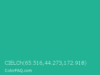 CIELCh 65.516,44.273,172.918 Color is a normal cyan color and the nearest color is Mountain Meadow Crayola #1ab385. Hex code #21b394 and RGB value is rgb(33,179,148). In RGB color space, this color is composed of 13% red, 70% green, 58% blue, In CMYK color space, this color is composed of 82% cyan, 0% magenta, 17% yellow , 30% black , In HSL color space, this color has a hue angle of 167° , 69% saturation and 42% lightness.