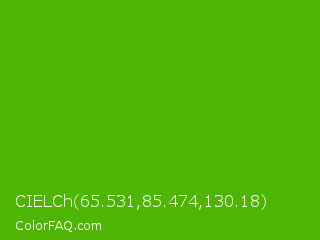 CIELCh 65.531,85.474,130.18 Color is a normal green color and the nearest color is Kelly Green #4cbb17. Hex code #4fb505 and RGB value is rgb(79,181,5). In RGB color space, this color is composed of 31% red, 71% green, 2% blue, In CMYK color space, this color is composed of 56% cyan, 0% magenta, 97% yellow , 29% black , In HSL color space, this color has a hue angle of 95° , 95% saturation and 36% lightness.
