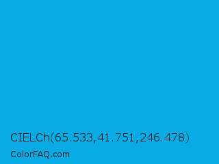 CIELCh 65.533,41.751,246.478 Color is a normal blue color and the nearest color is Vivid Cerulean #00aaee. Hex code #08abe3 and RGB value is rgb(8,171,227). In RGB color space, this color is composed of 3% red, 67% green, 89% blue, In CMYK color space, this color is composed of 96% cyan, 25% magenta, 0% yellow , 11% black , In HSL color space, this color has a hue angle of 195° , 93% saturation and 46% lightness.