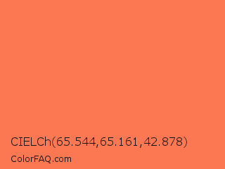CIELCh 65.544,65.161,42.878 Color is a light red color and the nearest color is Coral #ff7f50. Hex code #fc7852 and RGB value is rgb(252,120,82). In RGB color space, this color is composed of 99% red, 47% green, 32% blue, In CMYK color space, this color is composed of 0% cyan, 52% magenta, 67% yellow , 1% black , In HSL color space, this color has a hue angle of 13° , 97% saturation and 65% lightness.