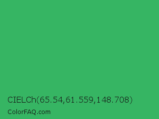 CIELCh 65.54,61.559,148.708 Color is a normal green color and the nearest color is Medium Sea Green #3cb371. Hex code #36b563 and RGB value is rgb(54,181,99). In RGB color space, this color is composed of 21% red, 71% green, 39% blue, In CMYK color space, this color is composed of 70% cyan, 0% magenta, 45% yellow , 29% black , In HSL color space, this color has a hue angle of 141° , 54% saturation and 46% lightness.