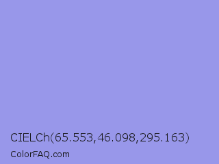 CIELCh 65.553,46.098,295.163 Color is a light indigo color and the nearest color is Portage #8b9fee. Hex code #9897ea and RGB value is rgb(152,151,234). In RGB color space, this color is composed of 60% red, 59% green, 92% blue, In CMYK color space, this color is composed of 35% cyan, 35% magenta, 0% yellow , 8% black , In HSL color space, this color has a hue angle of 241° , 66% saturation and 75% lightness.