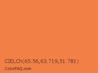 CIELCh 65.56,63.719,51.781 Color is a light orange color and the nearest color is Mandarin #f37a48. Hex code #f28046 and RGB value is rgb(242,128,70). In RGB color space, this color is composed of 95% red, 50% green, 27% blue, In CMYK color space, this color is composed of 0% cyan, 47% magenta, 71% yellow , 5% black , In HSL color space, this color has a hue angle of 20° , 87% saturation and 61% lightness.