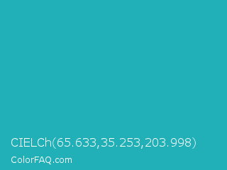 CIELCh 65.633,35.253,203.998 Color is a normal cyan color and the nearest color is Light Sea Green #20b2aa. Hex code #22b0b8 and RGB value is rgb(34,176,184). In RGB color space, this color is composed of 13% red, 69% green, 72% blue, In CMYK color space, this color is composed of 82% cyan, 4% magenta, 0% yellow , 28% black , In HSL color space, this color has a hue angle of 183° , 69% saturation and 43% lightness.