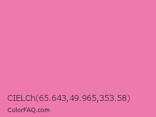 CIELCh 65.643,49.965,353.58 Color is a light rose color and the nearest color is Carissma #ea88a8. Hex code #ed7aab and RGB value is rgb(237,122,171). In RGB color space, this color is composed of 93% red, 48% green, 67% blue, In CMYK color space, this color is composed of 0% cyan, 49% magenta, 28% yellow , 7% black , In HSL color space, this color has a hue angle of 334° , 76% saturation and 70% lightness.