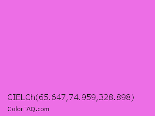 CIELCh 65.647,74.959,328.898 Color is a light magenta color and the nearest color is Lavender Magenta #ee82ee. Hex code #ed6ee6 and RGB value is rgb(237,110,230). In RGB color space, this color is composed of 93% red, 43% green, 90% blue, In CMYK color space, this color is composed of 0% cyan, 54% magenta, 3% yellow , 7% black , In HSL color space, this color has a hue angle of 303° , 78% saturation and 68% lightness.