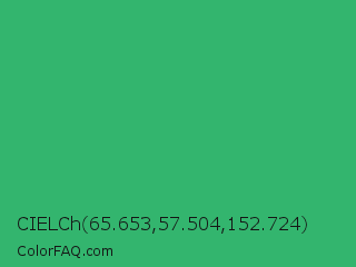 CIELCh 65.653,57.504,152.724 Color is a normal green color and the nearest color is Medium Sea Green #3cb371. Hex code #33b56e and RGB value is rgb(51,181,110). In RGB color space, this color is composed of 20% red, 71% green, 43% blue, In CMYK color space, this color is composed of 72% cyan, 0% magenta, 39% yellow , 29% black , In HSL color space, this color has a hue angle of 147° , 56% saturation and 45% lightness.