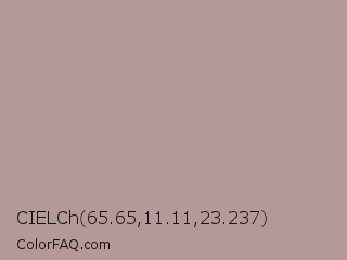 CIELCh 65.65,11.11,23.237 Color is a light red color and the nearest color is Thatch #b69d98. Hex code #b59998 and RGB value is rgb(181,153,152). In RGB color space, this color is composed of 71% red, 60% green, 60% blue, In CMYK color space, this color is composed of 0% cyan, 15% magenta, 16% yellow , 29% black , In HSL color space, this color has a hue angle of 2° , 16% saturation and 65% lightness.