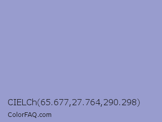 CIELCh 65.677,27.764,290.298 Color is a light blue color and the nearest color is Blue Bell Crayola #9999cc. Hex code #989cce and RGB value is rgb(152,156,206). In RGB color space, this color is composed of 60% red, 61% green, 81% blue, In CMYK color space, this color is composed of 26% cyan, 24% magenta, 0% yellow , 19% black , In HSL color space, this color has a hue angle of 236° , 36% saturation and 70% lightness.