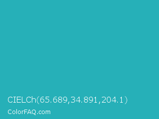 CIELCh 65.689,34.891,204.1 Color is a normal cyan color and the nearest color is Light Sea Green #20b2aa. Hex code #26b0b8 and RGB value is rgb(38,176,184). In RGB color space, this color is composed of 15% red, 69% green, 72% blue, In CMYK color space, this color is composed of 79% cyan, 4% magenta, 0% yellow , 28% black , In HSL color space, this color has a hue angle of 183° , 66% saturation and 44% lightness.