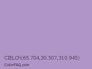 CIELCh 65.704,30.507,310.945 Color is a light purple color and the nearest color is East Side #ac91ce. Hex code #b095c9 and RGB value is rgb(176,149,201). In RGB color space, this color is composed of 69% red, 58% green, 79% blue, In CMYK color space, this color is composed of 12% cyan, 26% magenta, 0% yellow , 21% black , In HSL color space, this color has a hue angle of 271° , 33% saturation and 69% lightness.