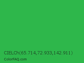 CIELCh 65.714,72.933,142.911 Color is a normal green color and the nearest color is Wageningen Green #34b233. Hex code #2eb74b and RGB value is rgb(46,183,75). In RGB color space, this color is composed of 18% red, 72% green, 29% blue, In CMYK color space, this color is composed of 75% cyan, 0% magenta, 59% yellow , 28% black , In HSL color space, this color has a hue angle of 133° , 60% saturation and 45% lightness.