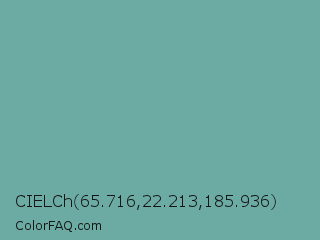 CIELCh 65.716,22.213,185.936 Color is a normal cyan color and the nearest color is Green Sheen #6eaea1. Hex code #6caba3 and RGB value is rgb(108,171,163). In RGB color space, this color is composed of 42% red, 67% green, 64% blue, In CMYK color space, this color is composed of 37% cyan, 0% magenta, 5% yellow , 33% black , In HSL color space, this color has a hue angle of 172° , 27% saturation and 55% lightness.