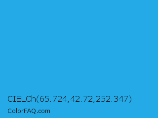 CIELCh 65.724,42.72,252.347 Color is a normal blue color and the nearest color is Button Blue #24a0ed. Hex code #25aae8 and RGB value is rgb(37,170,232). In RGB color space, this color is composed of 15% red, 67% green, 91% blue, In CMYK color space, this color is composed of 84% cyan, 27% magenta, 0% yellow , 9% black , In HSL color space, this color has a hue angle of 199° , 81% saturation and 53% lightness.