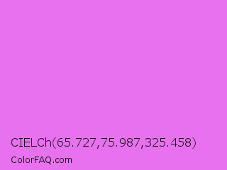 CIELCh 65.727,75.987,325.458 Color is a light magenta color and the nearest color is Lavender Magenta #ee82ee. Hex code #e771ee and RGB value is rgb(231,113,238). In RGB color space, this color is composed of 91% red, 44% green, 93% blue, In CMYK color space, this color is composed of 3% cyan, 53% magenta, 0% yellow , 7% black , In HSL color space, this color has a hue angle of 297° , 79% saturation and 69% lightness.