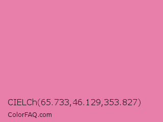 CIELCh 65.733,46.129,353.827 Color is a light rose color and the nearest color is Carissma #ea88a8. Hex code #e87eaa and RGB value is rgb(232,126,170). In RGB color space, this color is composed of 91% red, 49% green, 67% blue, In CMYK color space, this color is composed of 0% cyan, 46% magenta, 27% yellow , 9% black , In HSL color space, this color has a hue angle of 335° , 70% saturation and 70% lightness.