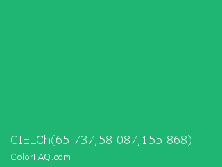 CIELCh 65.737,58.087,155.868 Color is a normal green color and the nearest color is Green Crayola #1cac78. Hex code #1fb673 and RGB value is rgb(31,182,115). In RGB color space, this color is composed of 12% red, 71% green, 45% blue, In CMYK color space, this color is composed of 83% cyan, 0% magenta, 37% yellow , 29% black , In HSL color space, this color has a hue angle of 153° , 71% saturation and 42% lightness.