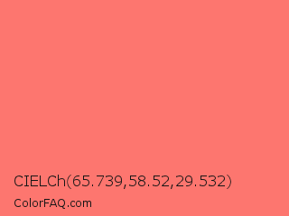 CIELCh 65.739,58.52,29.532 Color is a light red color and the nearest color is Coral Reef Hipster Salmon #fd7c6e. Hex code #fd766f and RGB value is rgb(253,118,111). In RGB color space, this color is composed of 99% red, 46% green, 44% blue, In CMYK color space, this color is composed of 0% cyan, 53% magenta, 56% yellow , 1% black , In HSL color space, this color has a hue angle of 3° , 97% saturation and 71% lightness.