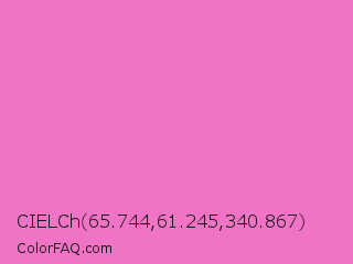 CIELCh 65.744,61.245,340.867 Color is a light magenta color and the nearest color is Persian Pink #f77fbe. Hex code #f173c5 and RGB value is rgb(241,115,197). In RGB color space, this color is composed of 95% red, 45% green, 77% blue, In CMYK color space, this color is composed of 0% cyan, 52% magenta, 18% yellow , 5% black , In HSL color space, this color has a hue angle of 321° , 82% saturation and 70% lightness.