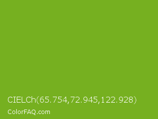 CIELCh 65.754,72.945,122.928 Color is a normal green color and the nearest color is Lima #76bd17. Hex code #76b020 and RGB value is rgb(118,176,32). In RGB color space, this color is composed of 46% red, 69% green, 13% blue, In CMYK color space, this color is composed of 33% cyan, 0% magenta, 82% yellow , 31% black , In HSL color space, this color has a hue angle of 84° , 69% saturation and 41% lightness.