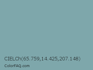 CIELCh 65.759,14.425,207.148 Color is a normal cyan color and the nearest color is Gumbo #7ca1a6. Hex code #7ea7ab and RGB value is rgb(126,167,171). In RGB color space, this color is composed of 49% red, 65% green, 67% blue, In CMYK color space, this color is composed of 26% cyan, 2% magenta, 0% yellow , 33% black , In HSL color space, this color has a hue angle of 185° , 21% saturation and 58% lightness.