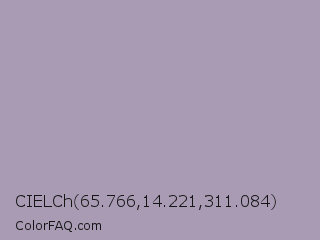 CIELCh 65.766,14.221,311.084 Color is a light purple color and the nearest color is Amethyst Smoke #a397b4. Hex code #a89bb3 and RGB value is rgb(168,155,179). In RGB color space, this color is composed of 66% red, 61% green, 70% blue, In CMYK color space, this color is composed of 6% cyan, 13% magenta, 0% yellow , 30% black , In HSL color space, this color has a hue angle of 273° , 14% saturation and 65% lightness.