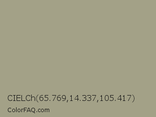 CIELCh 65.769,14.337,105.417 Color is a normal yellow color and the nearest color is Sage #9ea587. Hex code #a3a187 and RGB value is rgb(163,161,135). In RGB color space, this color is composed of 64% red, 63% green, 53% blue, In CMYK color space, this color is composed of 0% cyan, 1% magenta, 17% yellow , 36% black , In HSL color space, this color has a hue angle of 56° , 13% saturation and 58% lightness.