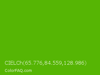CIELCh 65.776,84.559,128.986 Color is a normal green color and the nearest color is Kelly Green #4cbb17. Hex code #56b504 and RGB value is rgb(86,181,4). In RGB color space, this color is composed of 34% red, 71% green, 2% blue, In CMYK color space, this color is composed of 52% cyan, 0% magenta, 98% yellow , 29% black , In HSL color space, this color has a hue angle of 92° , 96% saturation and 36% lightness.