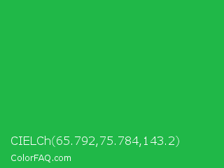 CIELCh 65.792,75.784,143.2 Color is a normal green color and the nearest color is Wageningen Green #34b233. Hex code #20b848 and RGB value is rgb(32,184,72). In RGB color space, this color is composed of 13% red, 72% green, 28% blue, In CMYK color space, this color is composed of 83% cyan, 0% magenta, 61% yellow , 28% black , In HSL color space, this color has a hue angle of 136° , 70% saturation and 42% lightness.