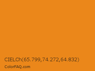CIELCh 65.799,74.272,64.832 Color is a normal orange color and the nearest color is Zest #e5841b. Hex code #eb871a and RGB value is rgb(235,135,26). In RGB color space, this color is composed of 92% red, 53% green, 10% blue, In CMYK color space, this color is composed of 0% cyan, 43% magenta, 89% yellow , 8% black , In HSL color space, this color has a hue angle of 31° , 84% saturation and 51% lightness.