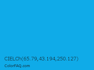 CIELCh 65.79,43.194,250.127 Color is a normal blue color and the nearest color is Vivid Cerulean #00aaee. Hex code #0fabe8 and RGB value is rgb(15,171,232). In RGB color space, this color is composed of 6% red, 67% green, 91% blue, In CMYK color space, this color is composed of 94% cyan, 26% magenta, 0% yellow , 9% black , In HSL color space, this color has a hue angle of 197° , 88% saturation and 48% lightness.