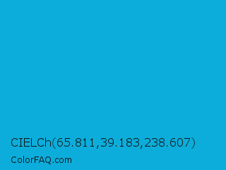 CIELCh 65.811,39.183,238.607 Color is a normal cyan color and the nearest color is Cerulean #02a4d3. Hex code #0caddb and RGB value is rgb(12,173,219). In RGB color space, this color is composed of 5% red, 68% green, 86% blue, In CMYK color space, this color is composed of 95% cyan, 21% magenta, 0% yellow , 14% black , In HSL color space, this color has a hue angle of 193° , 90% saturation and 45% lightness.