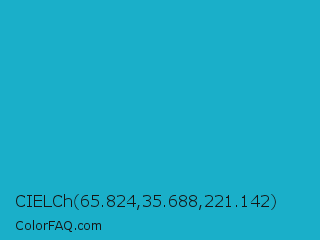 CIELCh 65.824,35.688,221.142 Color is a normal cyan color and the nearest color is Pacific Blue #1ca9c9. Hex code #1aafc9 and RGB value is rgb(26,175,201). In RGB color space, this color is composed of 10% red, 69% green, 79% blue, In CMYK color space, this color is composed of 87% cyan, 13% magenta, 0% yellow , 21% black , In HSL color space, this color has a hue angle of 189° , 77% saturation and 45% lightness.