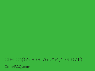 CIELCh 65.838,76.254,139.071 Color is a normal green color and the nearest color is Wageningen Green #34b233. Hex code #3ab73e and RGB value is rgb(58,183,62). In RGB color space, this color is composed of 23% red, 72% green, 24% blue, In CMYK color space, this color is composed of 68% cyan, 0% magenta, 66% yellow , 28% black , In HSL color space, this color has a hue angle of 122° , 52% saturation and 47% lightness.