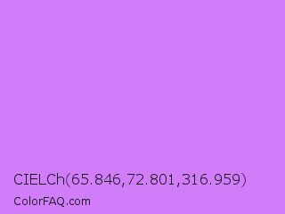 CIELCh 65.846,72.801,316.959 Color is a light purple color and the nearest color is Heliotrope #df73ff. Hex code #d17dfa and RGB value is rgb(209,125,250). In RGB color space, this color is composed of 82% red, 49% green, 98% blue, In CMYK color space, this color is composed of 16% cyan, 50% magenta, 0% yellow , 2% black , In HSL color space, this color has a hue angle of 280° , 93% saturation and 74% lightness.