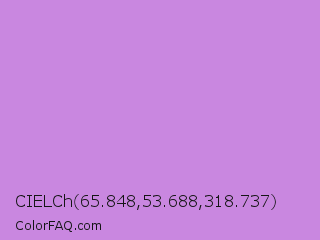 CIELCh 65.848,53.688,318.737 Color is a light purple color and the nearest color is Bright Lavender #bf94e4. Hex code #c987e0 and RGB value is rgb(201,135,224). In RGB color space, this color is composed of 79% red, 53% green, 88% blue, In CMYK color space, this color is composed of 10% cyan, 40% magenta, 0% yellow , 12% black , In HSL color space, this color has a hue angle of 284° , 59% saturation and 70% lightness.