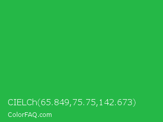 CIELCh 65.849,75.75,142.673 Color is a normal green color and the nearest color is Wageningen Green #34b233. Hex code #25b847 and RGB value is rgb(37,184,71). In RGB color space, this color is composed of 15% red, 72% green, 28% blue, In CMYK color space, this color is composed of 80% cyan, 0% magenta, 61% yellow , 28% black , In HSL color space, this color has a hue angle of 134° , 67% saturation and 43% lightness.